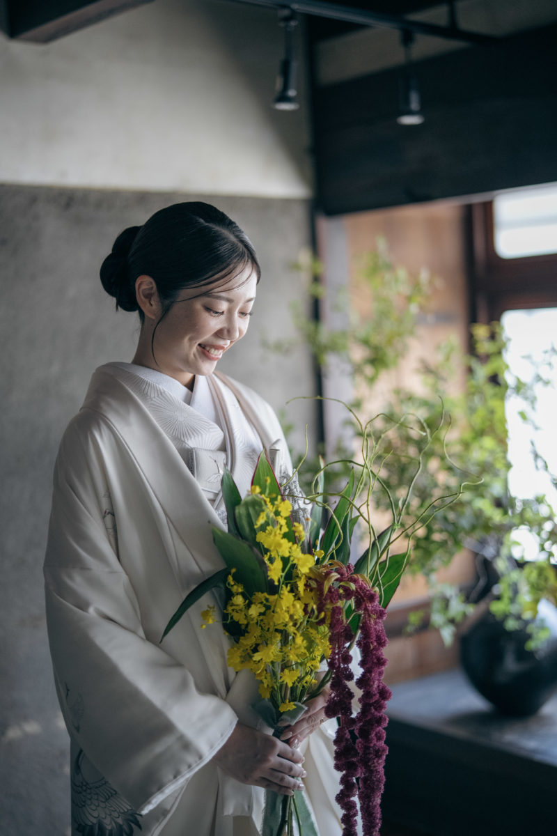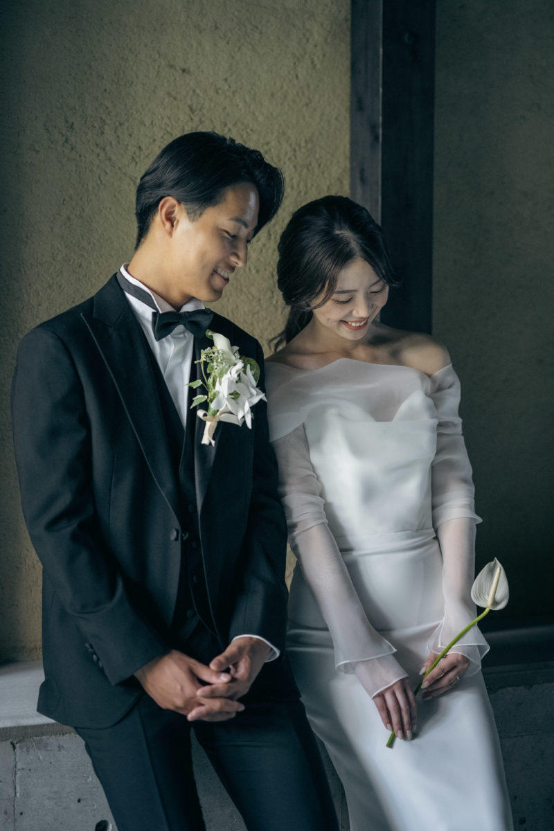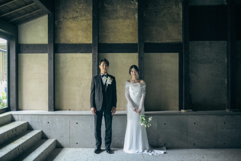 洗練された仕立てとミニマルなドレスのデザインは新婦様の凛とした雰囲気の中にある愛らしさが映えとてもお似合いでございます