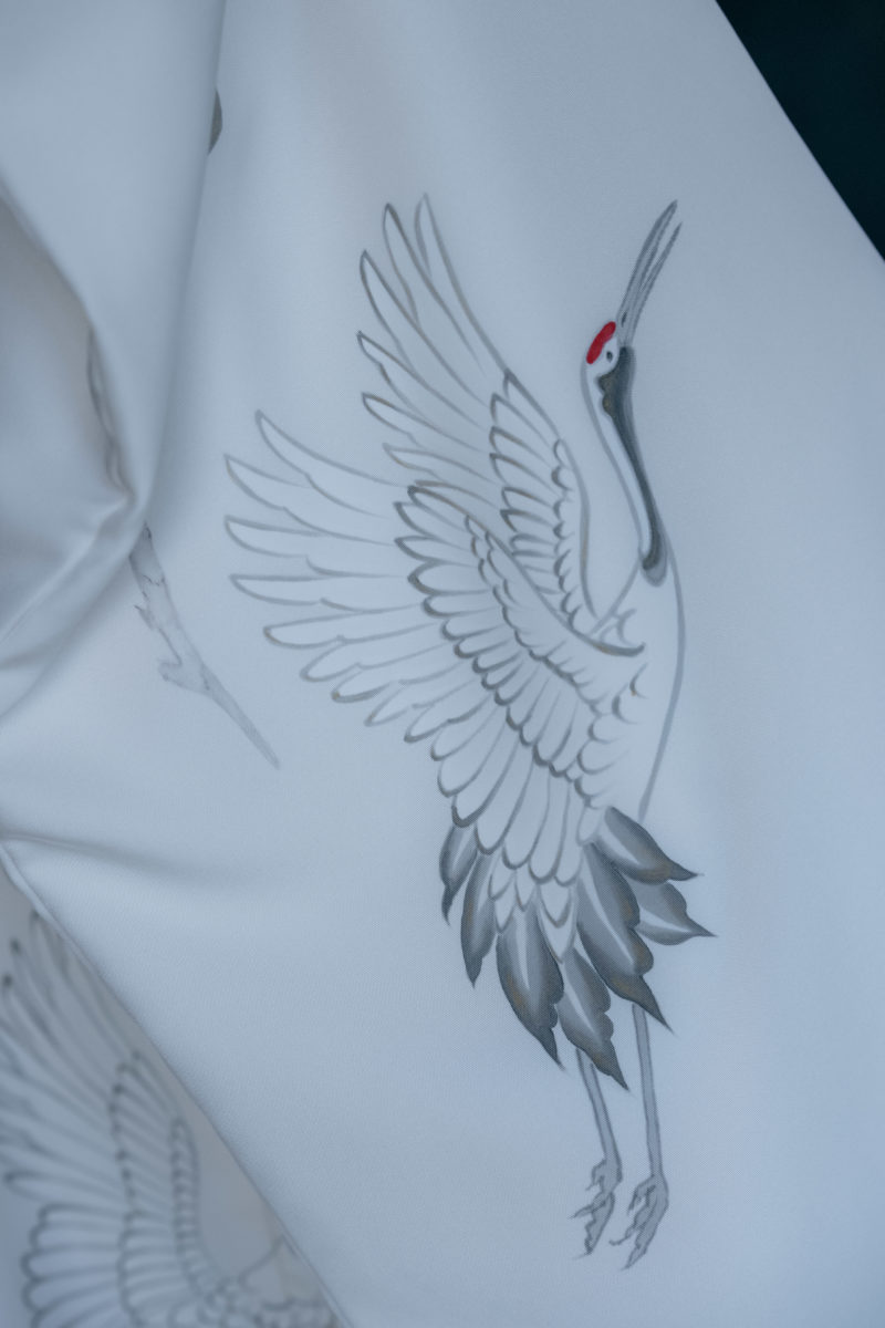 鶴丸の五つ紋も手描きであしらい、熟練の職人だからこそ成し得る唯一無二の格調高い一枚