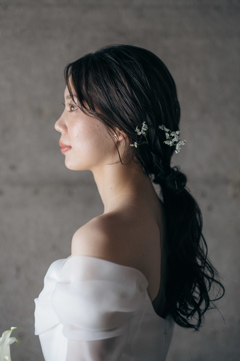 ヘアスタイルはあえてルーズにし装飾もシンプルにまとめることでお持ちの柔らかな美しさが最大限に引き出されていますね