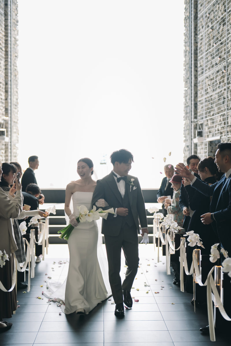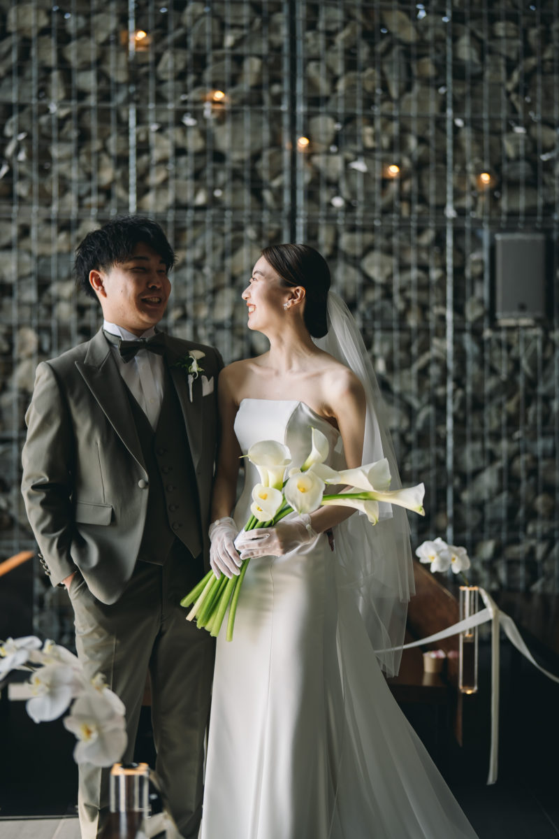 お選びいただいたウエディングドレスはモダンで洗練されたシルエットが光る1着。