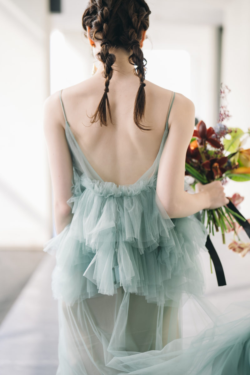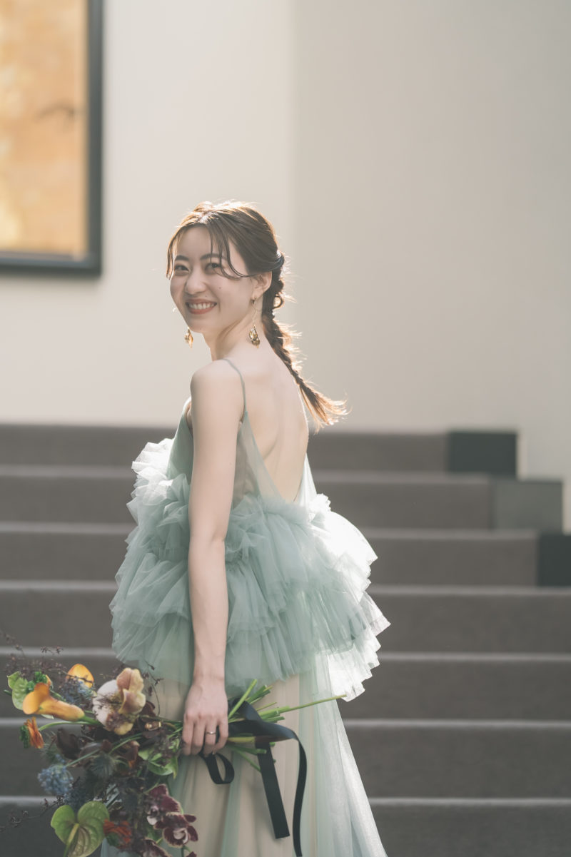 ミントグリーンのチュールを軽やかに纏わせたデザイン。