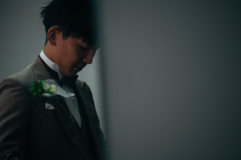 ご新郎様にお選びいただいたのは、明るく柔らかな色合いのブラウンのタキシード。