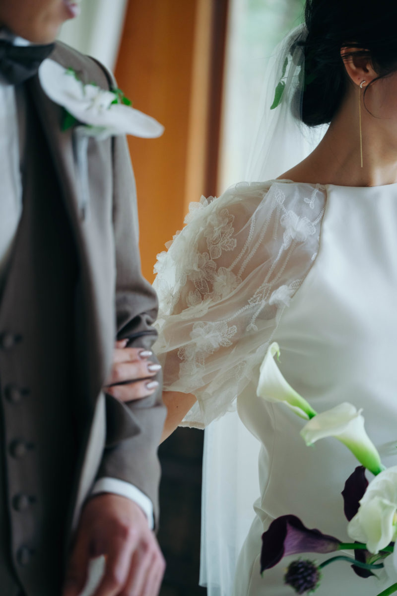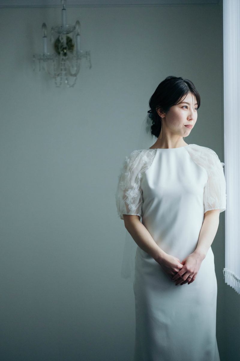 お選びいただいたウェディングドレスはクラシックで控えめなスレンダーライン。