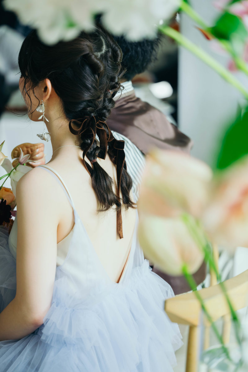 手刺繍の3D花柄レースのパフスリーブにオープンなバックスタイルが印象的な一着です。